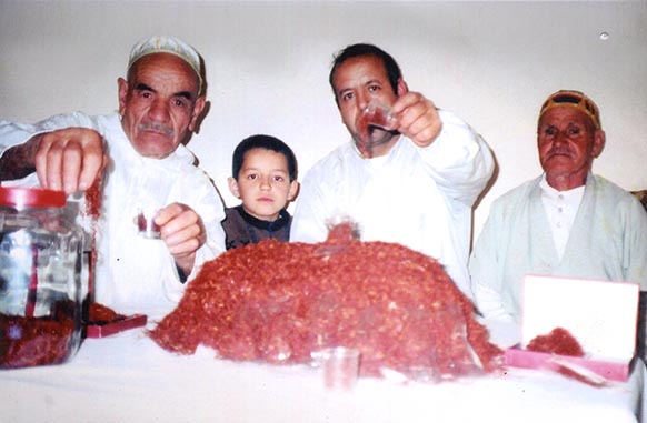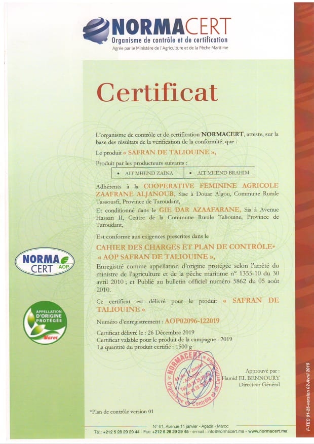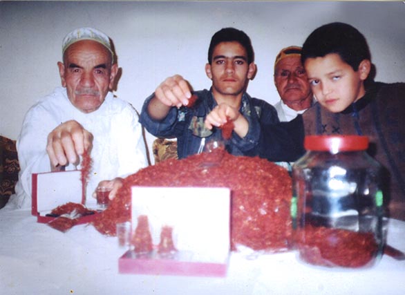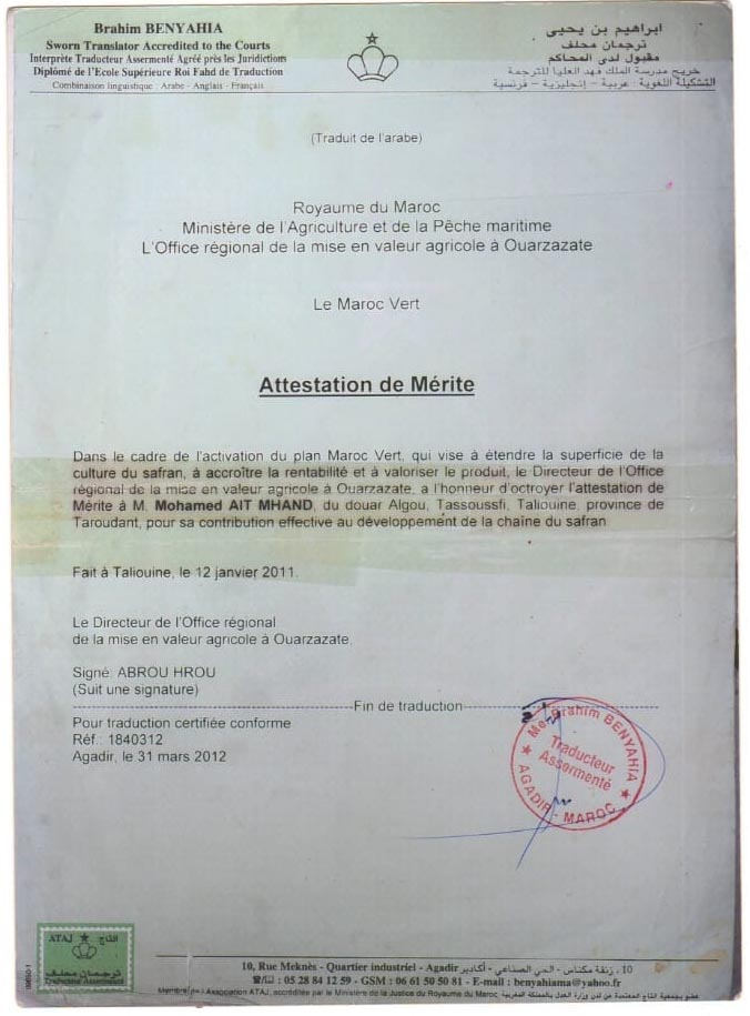 | Une petite coopérative féminine d'une quinzaine d'employés. Pour nous, il est vital de bien trier les pistils et de n'accepter que des produits de qualité. Ainsi, le safran est récolté entre octobre et novembre, à l'aube et avant le lever du soleil, un gage de qualité essentiel ! Nous ne vendons que directement du Maroc et dans nos emballages scellés. Notre établissement a été reconnu par sa majesté le Roi du Maroc lui-même, qui a délivré au fondateur un diplôme reconnaissant tradition, qualité et savoir-faire (page photos). |