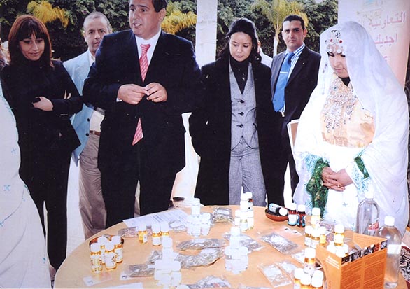 | Avec M. le Ministre du commerce marocain. | Le fondateur reçoit des mains de sa majesté le roi du Maroc son diplôme de qualité pour les nombreuses récoltes passées. |